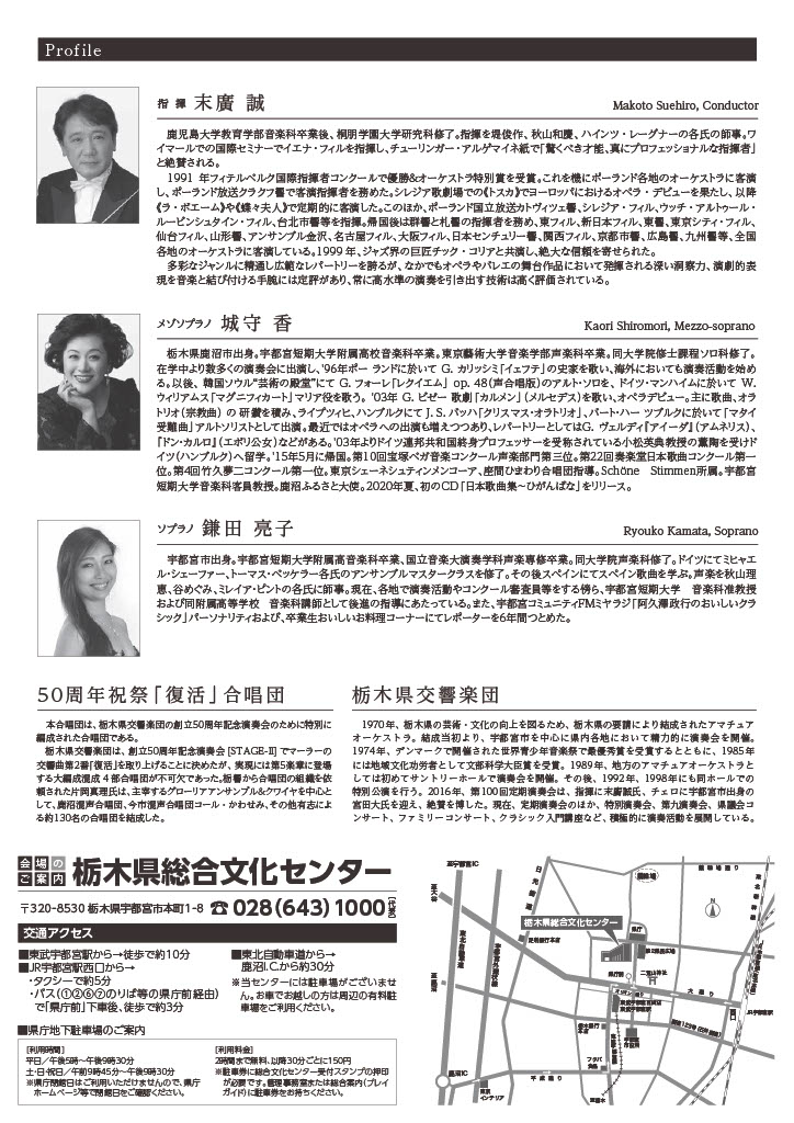 | 出 演 | 指揮:末廣 誠 メゾソプラノ:城守 香 ソプラノ:鎌田 亮子 合唱:50周年祝祭「復活」合唱団 |